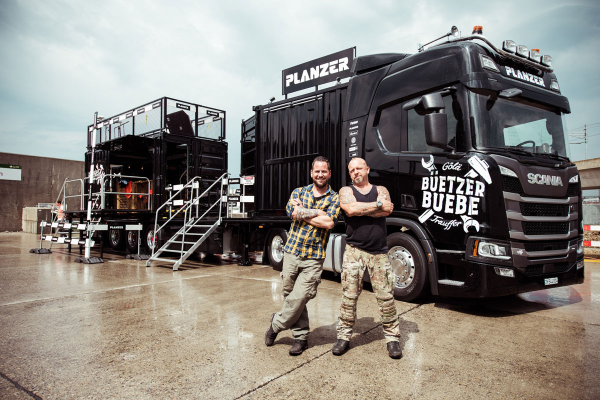 Für den 22. August 2020 war im Zürcher Letzigrund ein bis dahin einmaliges Ko-Konzert angekündigt. Davor wollten Göle und Trauffer durch die Schweiz touren und ihr Büetzer-Buebe-Projekt vorstellen. Dazu suchten sie ein geeignetes Mobil – am besten einen LKW – mit Materialcontainer, Sitzecke für Interviews und integrierter Bühne. Und natürlich sollten Villiger-Zigarren, Grills, Bigler-Bratwürste und gekühltes Bier jederzeit verfügbar sein. Aus der verrückten Idee wurde schon bald verrückte Realität. Im Juni 2019 legten unser Technikteam zum ersten Mal Hand an die Scania-Zugmaschine und die Aufbauten an. Sie testeten sämtliche Spezialanfertigungen vorab mit Computersimulation. Dann gings zur Sache. Am 26. Juli 2019 wurde das Hightech-Mobil an die beiden Partylöwen mit Pauken und Trompeten übergeben.
